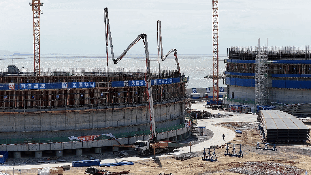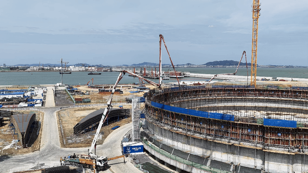 随着各环节建设有序推进,3座22万立方米的LNG(液化天然气)储罐正式进入罐体墙体浇筑。每座储罐高达50多米,相当于18层楼高度,海风裹挟的高湿度环境,给高空作业难度层层加码!