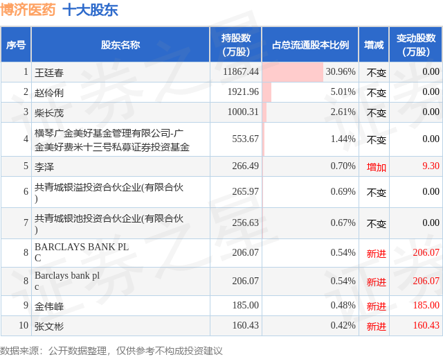 根据博济医药2025年中报公布的十大股东详情如下:
