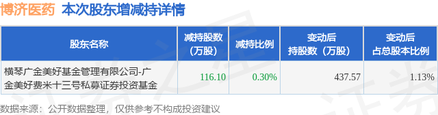 证券之星消息,10月17日博济医药发布公告《博济医药:关于控股股东及其一致行动人减持股份进展暨权益变动触及1%的公告》,其股东横琴广金美好基金管理有限公司-广金美好费米十三号私募证券投资基金于2025年9月12日至2025年10月17日间合计减持116.1万股,占公司目前总股本的0.3011%,变动期间该股股价下跌9.58%,截止10月17日收盘报9.72元。
