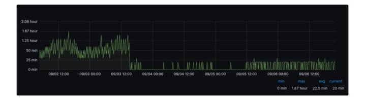 我们将数据集迁移到基于 Flink 的数据摄取平台,并确认基于 Flink 的数据摄取能够提供分钟级的数据新鲜度,同时相比批处理方式,计算资源消耗降低 25%。以下是一个数据新鲜度提升的示例。