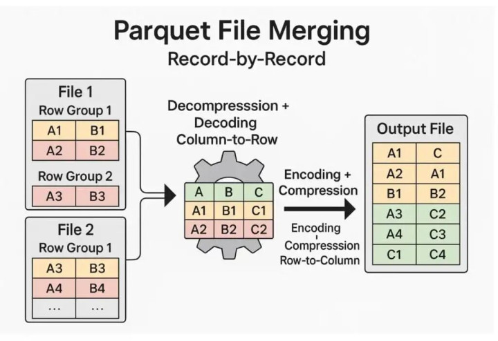 传统的合并方法是逐条记录进行操作,需要先解压缩每个 Parquet 文件,将其从列式解码为行式,然后进行合并,最后再重新编码和压缩。虽然这种方法可行,但由于重复的编码/解码转换,计算量巨大且速度缓慢。