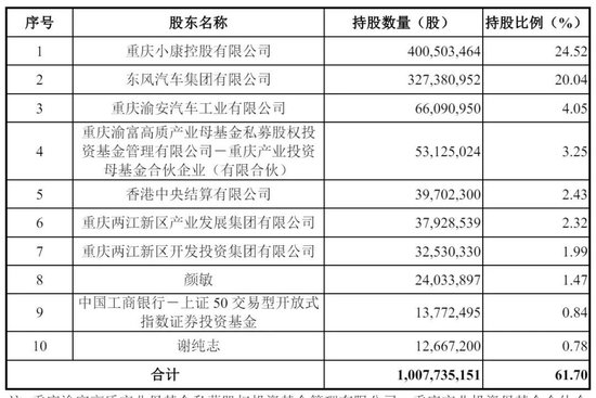 此次交易后,重庆小康控股持股24.52%,东风汽车公司持股20.04%,重庆渝安汽车工业有限公司(简称“渝安工业”)持股4.05%,重庆渝富高质产业母基金私募股权投资基金管理有限公司-重庆产业投资母基金合伙企业(有限合伙)持股为3.25%,香港中央结算有限公司持股为2.43%;