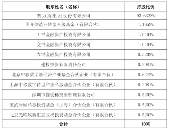 增资完成后,赛力斯汽车仍是赛力斯控股子公司,赛力斯持股93.6328%,国开制造业转型升级基金(有限合伙)持股为1.1652%,工银金融资产投资有限公司、交银金融资产投资有限公司分别持股1.0404%,北京中移数字新经济产业基金合伙企业(有限合伙)持股0.6242%;