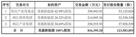 2025年初,赛力斯集团还完成并购龙盛新能源,是通过发行股份的方式购买重庆产业母基金、两江投资集团、两江产业集团持有的龙盛新能源100%股权一事的进展。龙盛新能源100%股权价值为81.64亿元。