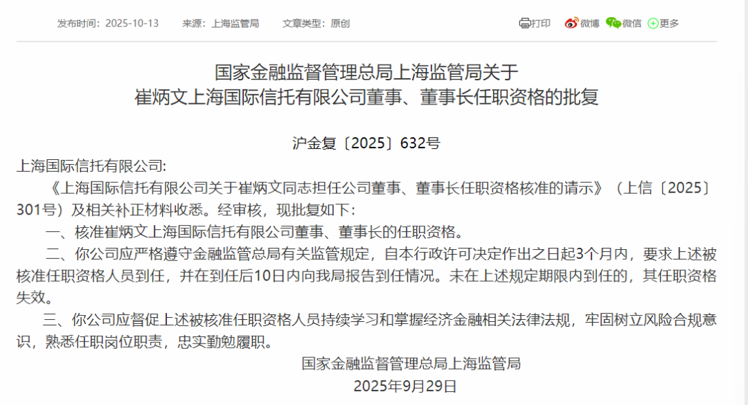 10月13日,国家金融监督管理总局上海监管局批复公告称,核准崔炳文上海国际信托有限公司(以下简称上海信托)董事、董事长的任职资格。这意味着上海信托董事长正式落定。