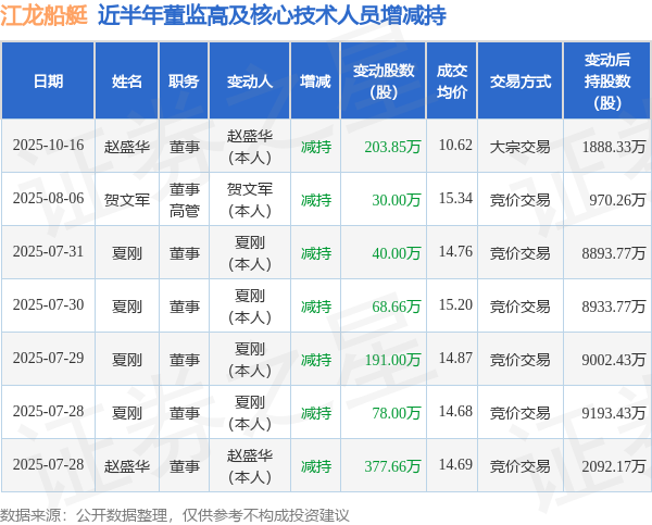 江龙船艇近半年内的董监高及核心技术人员增减持详情如下: