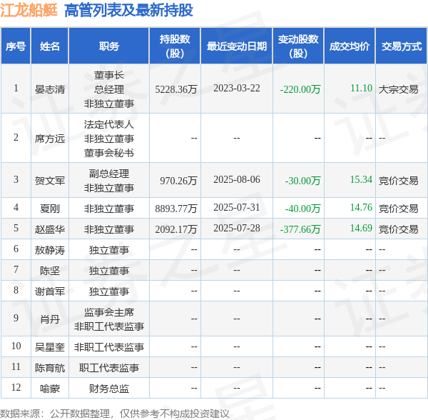 江龙船艇的高管列表及最新持股情况如下: