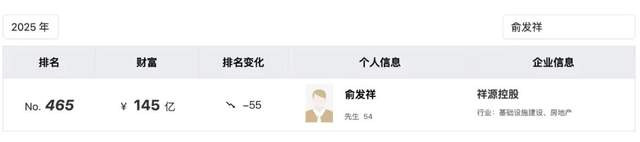 其身价也在资本的助力下水涨船高,2005年,俞发祥凭借嵊州祥源房产首次登陆《胡润百富榜》,身价5.5亿元;2018年,凭借祥源控股,俞发祥身价到达70亿元;2019年,俞发祥身价110亿元;到了2025年,据《胡润百富榜》,俞发祥倚靠祥源控股,财富值到达145亿元。