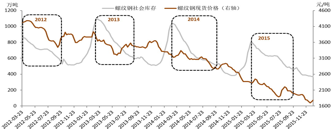 图为2012—2015年螺纹钢社会库存与现货价格走势